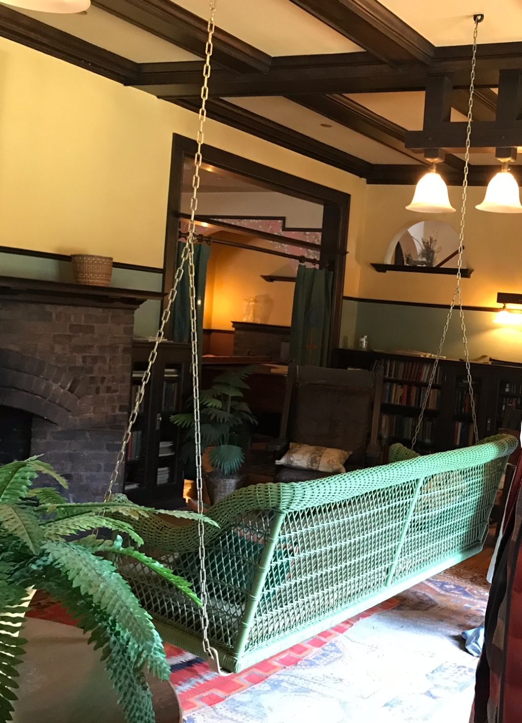 After lunch, we drove to the campus of Northern Arizona University to visit the Riordan Mansion. I have to admit I’m not usually a big fan of touring fancy houses and mansions. But this one did not disappoint. The house was built in 1904 by two brothers, Tim and Mike Riordan, who were married to sisters. The house is an enormous duplex. Again, we had a great docent, who brought the house to life. That wasn’t hard to do, however, because the house seemed so modern and comfortable. It was hard to believe it was build over 100 years ago. The bedrooms were big and sunny. The dining room had a table shaped like a canoe, so that all diners would face each other. And the living room had a large swing for a sofa. I was ready to move in! For me, it was an unexpected delight…..