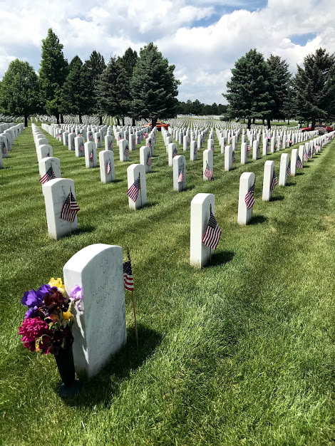 Sunday morning, Jen drove down from Fort Collins to spend the day with us. She and I made our annual trek to Fort Logan National Cemetery, where we laid flowers next to Mom and Dad’s headstone. The cemetery is always lovely as every year a Boy Scout troop sets flags next to each grave. Mom and Dad wouldn’t haunt us if we missed a year, but we have strong memories of making a trip every year with Mom to our grandparent’s graves in Columbus. Just as Mom did, our bouquet consisted of iris and peonies from my gardens…..