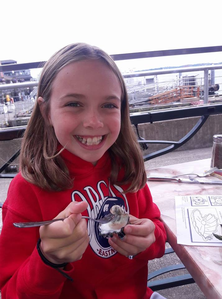 Our 13-year-old grandson Alastair loves fish and seafood. If he goes to a burger joint, he is just as likely to get fish-and-chips as he is a burger. Maggie Faith is also a fan of most seafood. She seems particularly drawn to scallops. But even more so, she is game to try anything. The McLains (who, as you will recall, are traveling via RV around the western United States) have currently landed in Seattle. The other night, they all went to a seafood place, where they enjoyed calamari and crab cakes and shrimp. And oysters on the half shell. None of the kids had tried them before, but Alastair and Maggie were game. Alastair proclaimed them to be “interesting,” but he had a smile on his face as he slurped them down. Maggie seems to be enjoying them a great deal…..