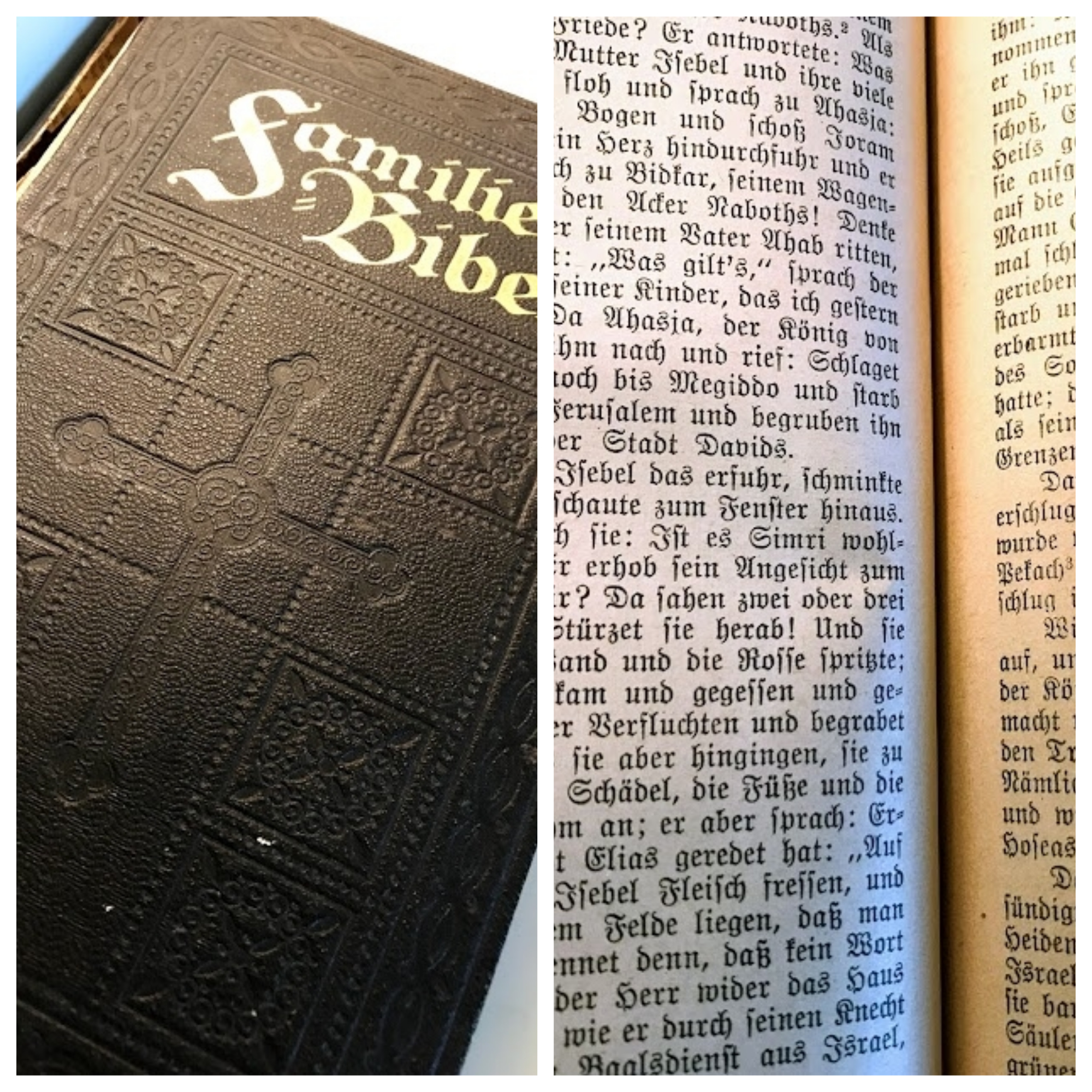 The third bible is the one that stumps me. Somehow – in that way that things happen – I ended up with Grammie’s bible. It’s entirely in German…..