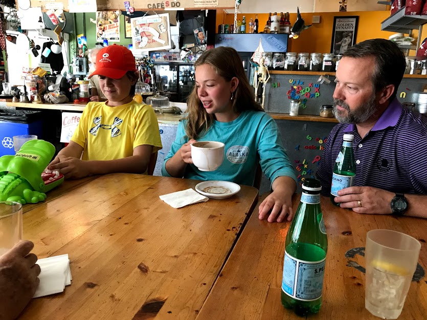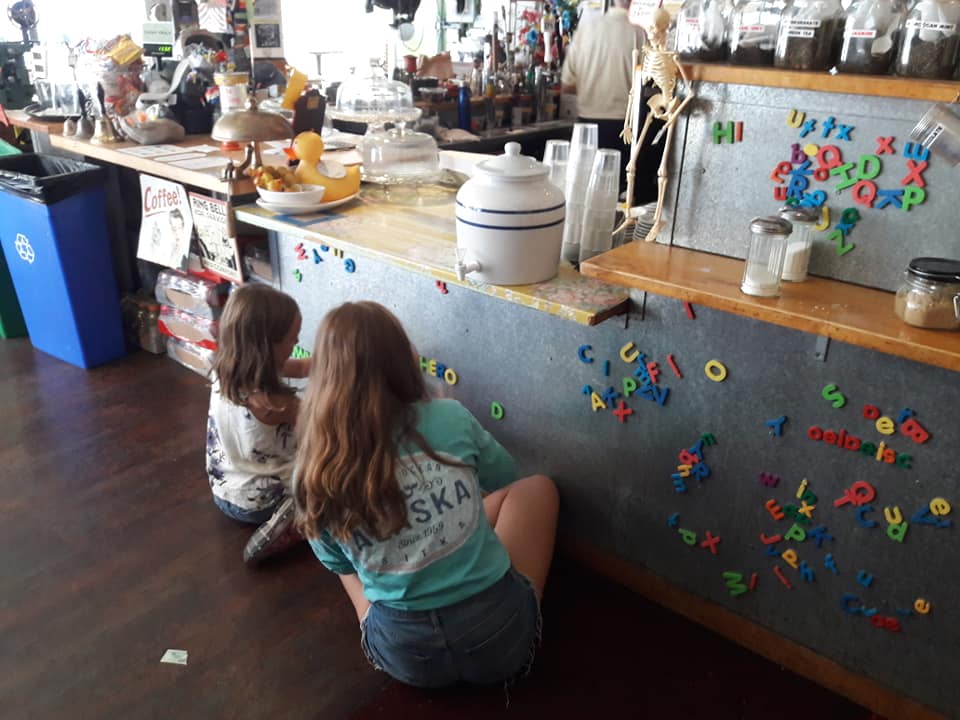 One day when we were all getting fairly thirsty (did I mention that we had unusually pleasant — even warm — weather, something for which we were all grateful), we stopped at a little cafe that turned out to be more than just a cafe. The Gallery Cafe instructs its customers to PUT DOWN YOUR TECHNOLOGY and talk to each other and to have some fun. There are old-school games…..