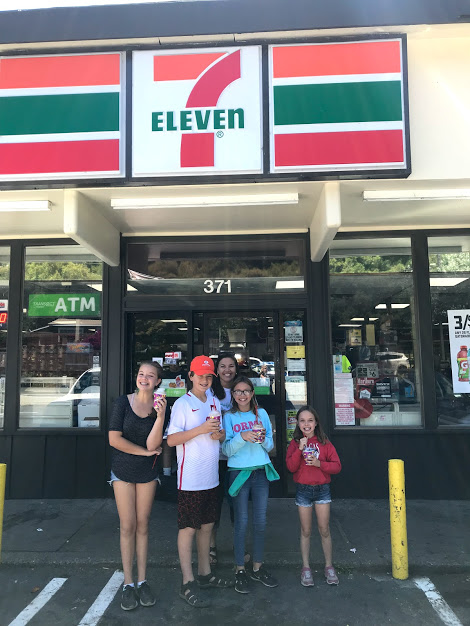 And finally, that same day as we were driving home from Muir Woods — July 11 — Jll suddenly made a screeching turn into a 7-11 store parking lot. Why? She remembered that it was July 11 — 7-11 — and they were giving away free icees. What can I say? More vacation fun…..