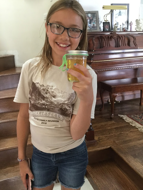 Hoo-rah! The bees had been producing honey. In fact, when the family came home last week for a reunion and Maggie Faith showed up on my doorstep, she informed me that Dagny couldn’t come because she was gathering honey from the bees.