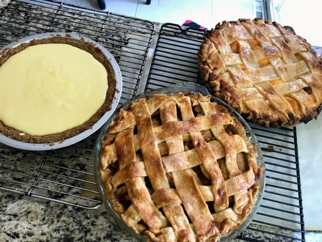 I mentioned in yesterday’s post that looking at photos of my grandkids cheered me up. Yesterday afternoon, I was further cheered because instead of doing what I should have been doing — namely, putting the things back that I had removed from my china cabinet over a year ago — I baked. Pies are my favorite things to bake, and nearly my favorite thing to eat. So I baked pies.