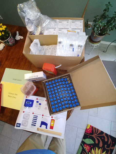 We walked into the doctor’s office at about 8:30, and walked out with dazed looks on our faces at 12:30. Three-and-a-half hours of us (mostly Bill) answering questions about his symptoms, his on-and-off times, his sleeping and eating habits, and whether he entertains thoughts of suicide (a clinical trial deal breaker), and a half hour of the research manager watching us connect Bill to his new BFF — The Pump.