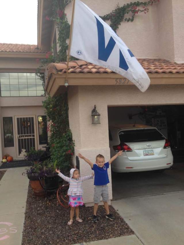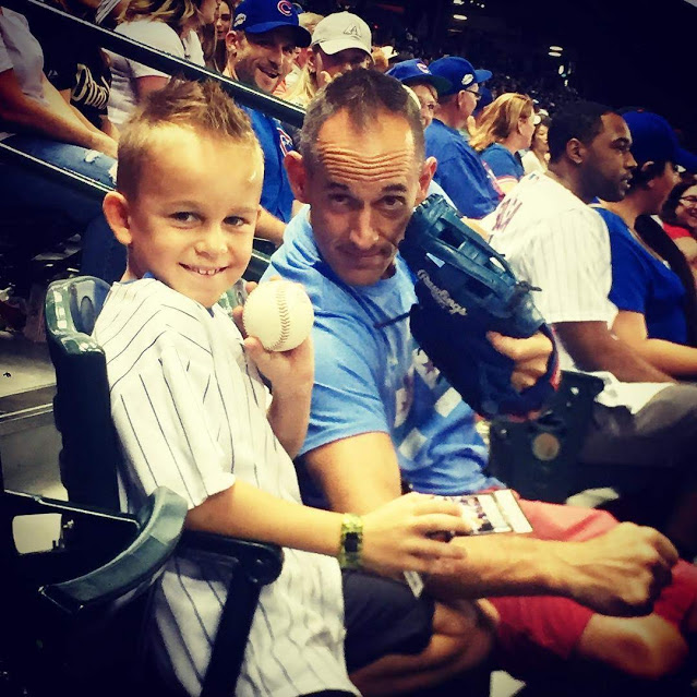 The other day, Austin and his dad Mark went to see the Chicago Cubs play the Arizona Diamondbacks. The two of them were rooting for the Cubs all the way. At some point a foul ball was hit by second baseman Ben Zorbrist, and it landed in Mark’s glove. Oh, the excitement! Oh, the joy! when his dad handed Austin — who, by the way, knows every word to the Go Cubs Go song — the ball…..