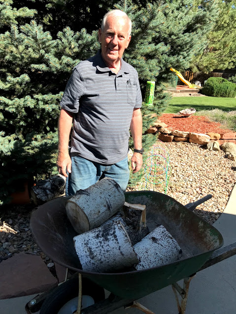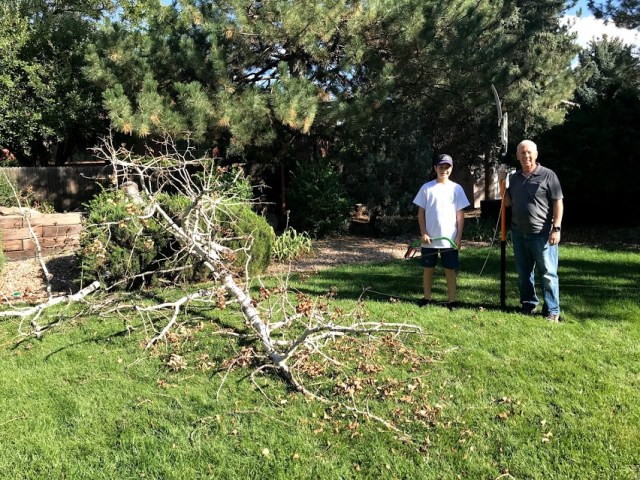 As the summer months have gone by, Bill and I have been pointing out to one another that the aspen tree near our back fence — the fence we just went halfies with our neighbor to replace — appeared to be getting sicker and sicker. Last fall, Bill and I were sitting in the family room watching television one night when we heard a very loud crash. We investigated, and discovered that one of our aspen trees — this one on the side of the house — had fallen. Thankfully, that one fell onto our patio rather than onto the neighbor’s yard. We were worried that we wouldn’t be that lucky a second time, and if the tree fell towards our neighbor’s yard, the fence would be destroyed. So this past Sunday, Bill called upon our grandson Alastair to help him cut down the aspen tree. After much ado, they were able to get the tree to fall down into our yard. Here are the two Paul Bunyans…..