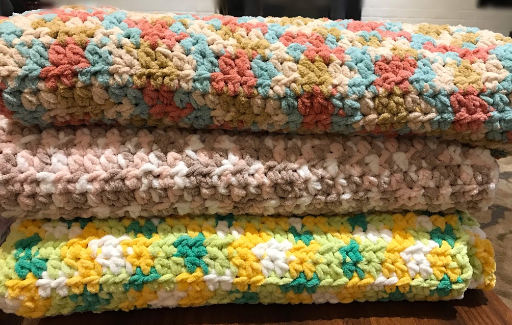These wonderful blankets are made out of the softest, warmest chenille blanket yarn that you can imagine. They are lap-sized, perfect for covering up as you watch television or read a book. The blankets are 48 inches long and 39 inches wide. The assortment of yarn colors is large. I sell them for $65. If you’re interested, see the link above to my Nana’s Whimsies Shop.