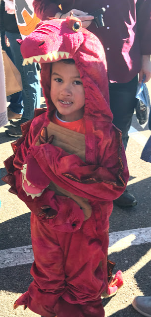 Many of ourgrandkids frolicked in costume at their school celebrations of All Hallows Eve. Each Halloween, Maggie Faith’s school ends the school day with a parade, followed by the song Thriller blasting from the intercom system while the kids dance. Sadly, I wasn’t able to attend because I wanted a chance to see Kaiya, Mylee, and Cole dressed up for the celebration. Cole’s school doesn’t allow for Halloween; instead, they call it Orange Day, and in lieu of wearing costumes, they wear orange. PC much? Cole wore Broncos orange for his school party, but changed into his dragon costume for Kaiya and Mylee’s parade…..