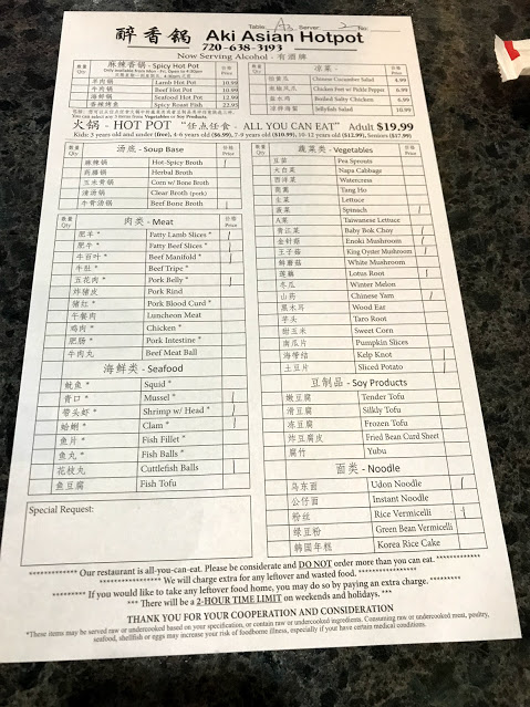 That date turned out to be one day last week, when she and I went to Aki Asian Hot Pot in a part of neighboring Aurora that has a decidedly Asian emphasis. There is, for example, a large Asian market right next door. I would have visited that market except for the fact that our lunch took a good two hours and Cole’s preschool teachers frown on parents picking up their kids late, especially smelling like garlic chili sauce. Pacific Ocean Market will have to wait for another day.