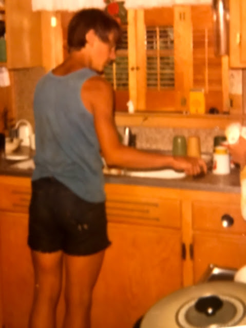 Our kitchen was very woody. My brother is washing something. Probably Matchbox cars.