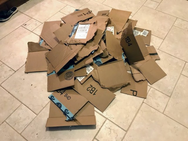 Since I’ve been buying most everything online (and have managed to avoid getting any of my packages pilfered by porch pirates), there are many, many boxes that we have to find a way to fit into our recycling bin. Bill spent an hour the other day cutting up boxes. Bless his heart…..
