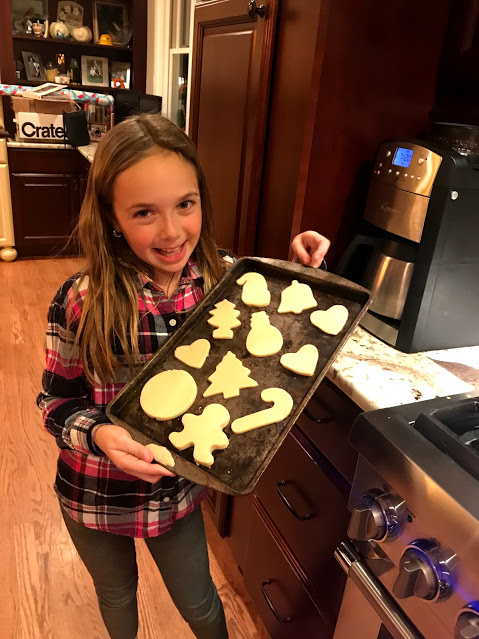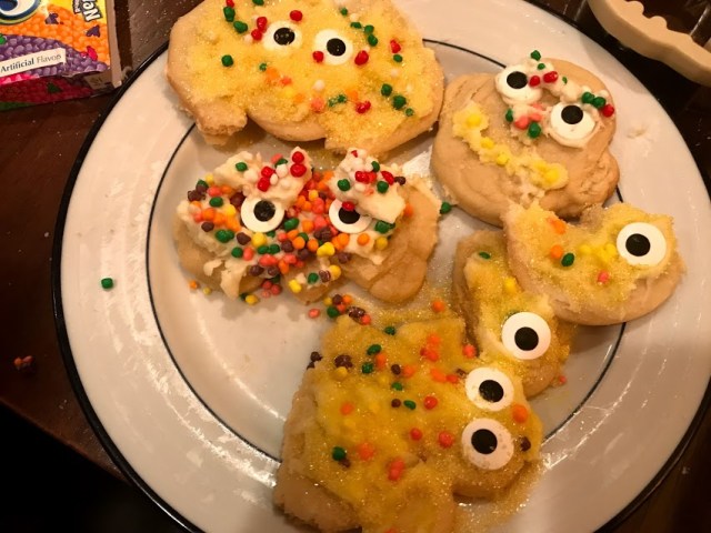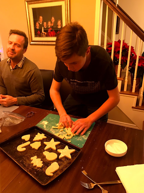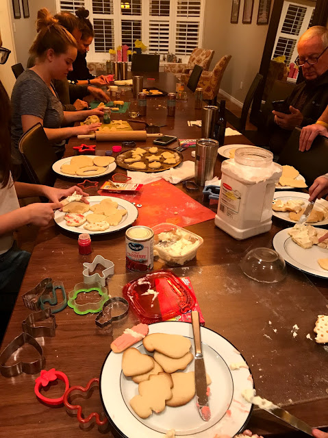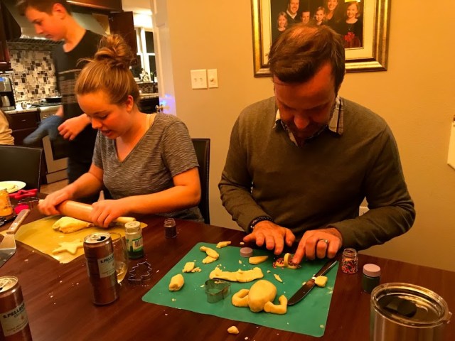 To celebrate my birthday, our family gathered at Dave and Jll’s house, where we ate pizza and salad. The high point, however, was after dinner, when the whole gang participated in the making and decorating of Christmas cookies…..