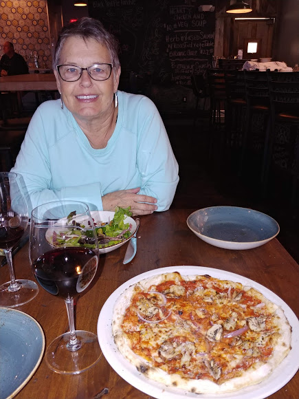 Our next pizza adventure was more successful. The fairly-recently-opened Osteria, located at 5609 E. McKellips Road in Mesa, is a higher-end restaurant offering a complete breakfast, lunch, and dinner menu that includes delicious pizzas cooked in a wood-fired oven, as well as salads and pastas. Bill and I ordered an Italian chopped salad, and then shared a pizza featuring their homemade fennel sausage and red onion…..