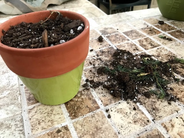 When I went out yesterday to check on them, the thyme and parsley were fine. The dill, however, looked like this…..