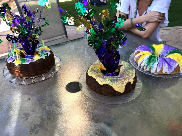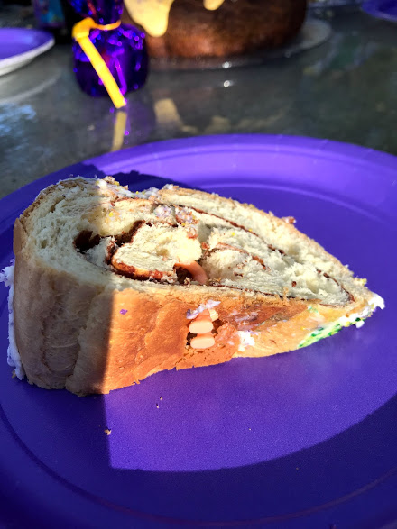 This year, as every year, we finished off our meal with one of Bec’s King Cakes, a traditional Mardi Gras feature. The traditional King Cake is a yeast and flour and sugar concoction similar to a cinnamon roll dough. Bec makes a sweeter version. The most important ingredient, however, is the baby. As is tradition, each cake includes a little plastic baby figurine. Traditionally, whoever gets the piece that includes the baby hosts next year’s party. And, people, it’s all about the baby.