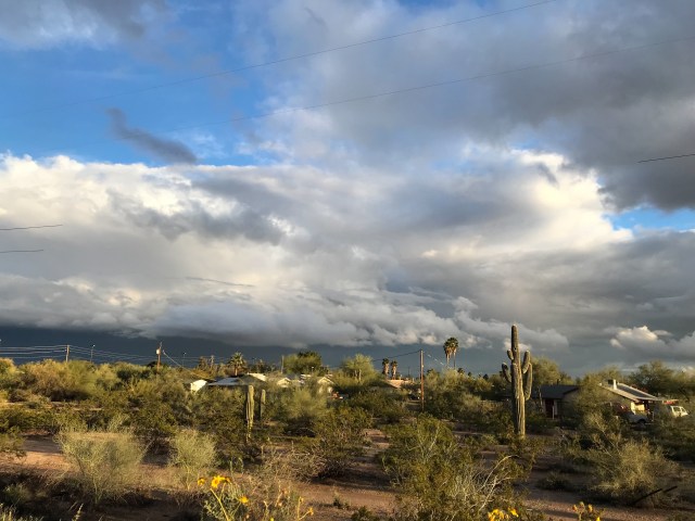 Our AZ weather has been unpredictable, but the resulting skies have been magnificent. The other afternoon when it couldn’t make up it’s mind whether to rain or be sunny, the view from the back yard was spectacular…..
