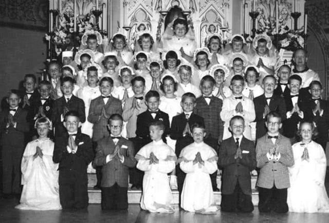 This photo was taken on May 7, 1961?, the day I, along with my fellow second graders, received our First Holy Communion. I must have studied this photo for an hour, trying to figure out who was who, where my second grade boyfriend was, how we could all have looked so freshly scrubbed and holy. My cousin David is the furthest on the left, as cute as a bug in a rug. Our teacher, Sister Colista, is barely poking her head above us in the upper left, second row from the top. She was mean as a snake. As for this holy little nana, I am in the top row, furthest to the right.