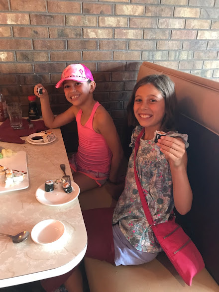 For Mylee’s birthday this year, in lieu of a traditional gift, I told her I would take her and a friend to lunch and an activity of her own choosing. She chose her long-time friend Ella. Her lunch choice was no surprise: sushi. The surprise was that Ella enjoyed it nearly as much as Mylee…..