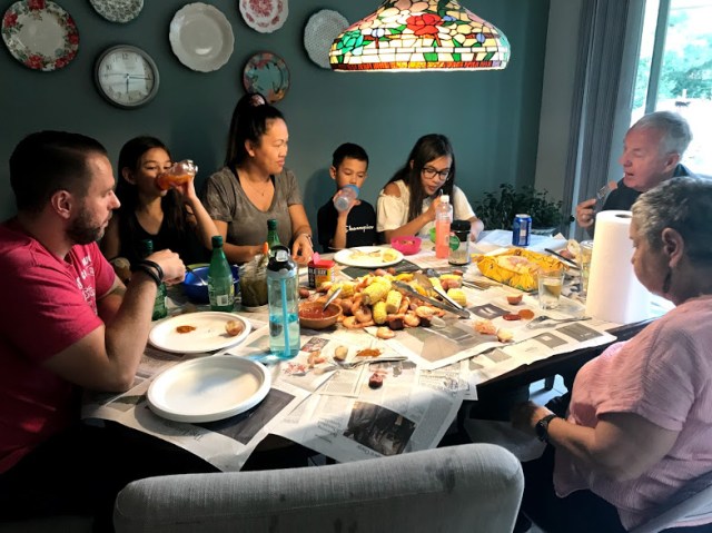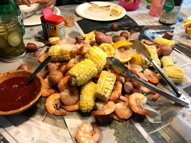 We had a wonderful, wonderful evening. We ate the seafood boil in the traditional way, off of the newspapers on the table……