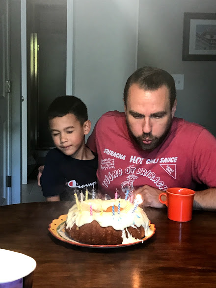 Cole and Mylee helped me put every candle I had in the house onto the cake, and led the way as we paraded into the room with the candles blazing. He blew them out in one try!……