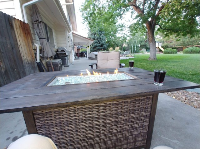 Not long after we bought our Denver home, Bill bought a hot tub. He also built a deck, and one of the areas was raised up, so that the hot tub fit flush into the deck. We used it quite a bit for many years. It finally went kaput and has been an unsightly paperweight in our backyard for quite a while. Well, no more. Over the past couple of weeks, Bill did what Bill does. Using a saw, he cut the hot tub into pieces and has slowly been loading up garbage bags to put out the week that they take extra garbage. In its place, he bought — on sale! — a fire pit fueled by propane…..