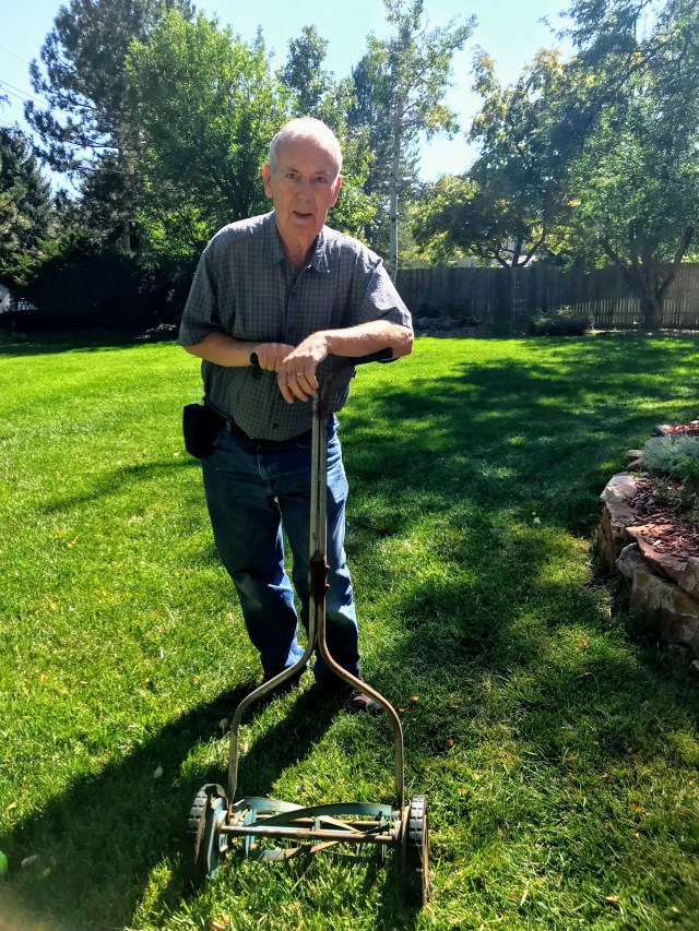 Last Thursday, I posted a photo of Bill showing our granddaughter Dagny how to repair the broken wheel on our lawnmower. Unfortunately, as is often the case, it wasn’t as easy to fix as Bill expected. He has been awaiting the arrival of the necessary parts. In the meantime, he went to our shed and, to my surprise, pulled out a manual push mower that I didn’t know he had, and still don’t know why he had it. He actually took a couple of rounds in our back yard before he gave up. He decided a third of an acre was a bit far to push a manual mower….