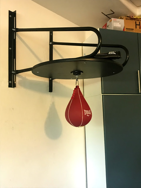 Anyone who knows anything about my husband knows that when Bill gets interested in something, he’s all in. The Rock Steady Boxing class that he has been taking has really captured his interest. In particular, he wants to improve his skills on the speed bags. Towards this end, he always wants to get there early so that he has time to practice before class. So it came as no surprise when he announced that he wanted to install a speed bag in our garage. This past week, he did just that…..