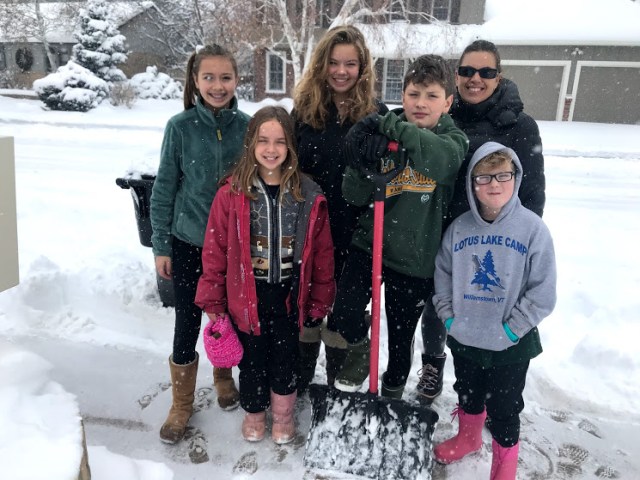 Yes, friends, it was my busy bee grandkids, along with their mom, shoveling our walk and driveway. Many hands make easy work. As for me, I quickly rustled up some hot chocolate. Here is the work crew, minus Alastair, who had already left for home…..