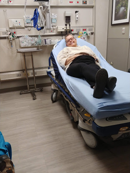 This is me patiently awaiting the results of my CT scan that I already KNEW would indicate a bowel obstruction. The smile is fake. The pain was real.