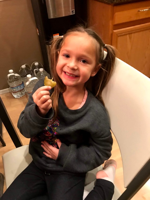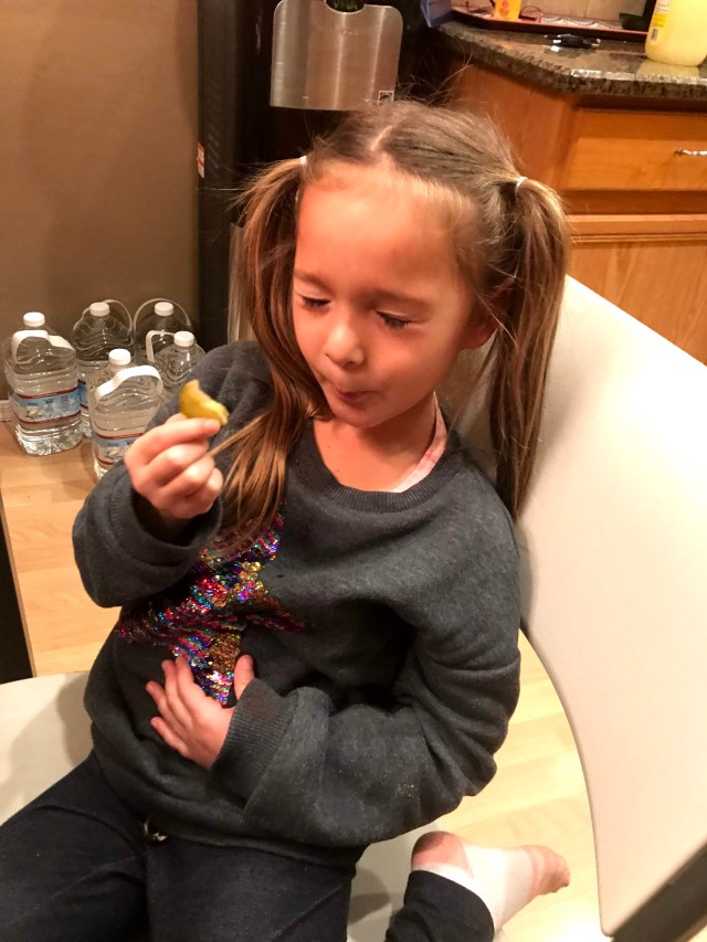 Maggie and Lilly came over for dinner Thursday night while Austin was at baseball practice with Coach Daddy. I grilled burgers, though I did so under light sprinkles. As part of my condiments, I offered some of my homemade dill pickles. Five-year-old Lilly took a bite…..