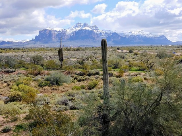 Don’t get me wrong. Arizona gets snow. Up in the area around Flagstaff, it snows. In fact, there is actually a ski area outside of Flag. Or should I say a “ski area” because, at the risk of sounding like a snob, no Coloradan with any sense would consider it much of a mountain. Even beautiful Superstition Mountain a mere 15 miles east of our AZ home will occasionally get a dusting of snow…..