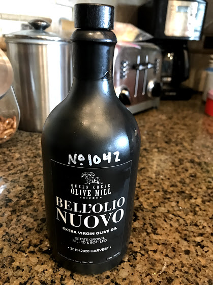 ….which is very freshly milled and never makes it to the grocery shelf. The bottle is black, as you can see. Olive oil should always live in a dark bottle. (Note to self: use my clear bottles for something else.) The flavor is intense and delicious. I bought a bottle that I will share with my son Court.