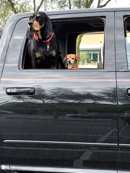 As I was coming out of the grocery store the other day, I saw this truck next to my car. I was greeted with barking by these two pooches, clearly BFFs…..