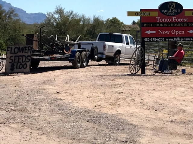 I mentioned that we drove to Lost Dutchman State Park last weekend, but couldn’t get in because there were so many folks with the same idea. I posted some photos from our drive, especially of the beautiful flowers. We saw a man sitting in front of a particularly beautiful field of flowers who has carved out a niche for himself — selling the seeds from these flowers. At a dollar a packet, he’s going to have to sell a lot of seeds….