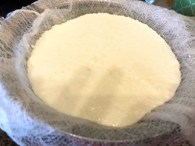 Once that happened, I poured the mixture through a sieve lined with cheesecloth, and let it drip for 25 minutes…..