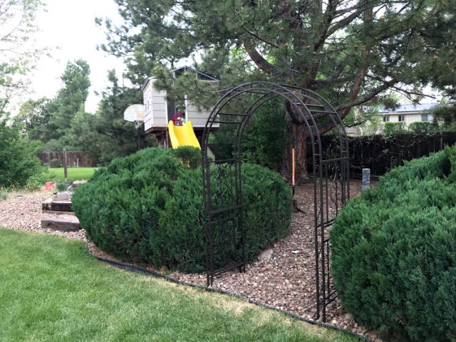 A week or so ago, Bill got the idea to remove one or two of our iris patches that weren’t really blooming (due to inadequate care, shame on me), and put in a garden arch leading to the back of our yard. The arch arrived from Wayfair day before yesterday, and he spent yesterday assembling it and putting it into our yard. I love the way it looks. I’m just trying to decide whether or not to put some sort of vine to climb up the wrought iron. Will I be sorry to have an out-of-control vine in my back yard?…..