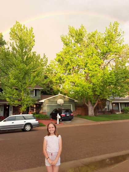 After a perfectly sunny day, about 7 o’clock in the evening, it started to rain. It was a lovely rain with no thunder or lightning. Since we had just finished dinner with Dave and Jll and the kids (who are leaving Friday for Montana), we decided to move out to their front porch and watch the rain. It wasn’t long before the sun was trying to come out, despite the rain. I knew if we looked hard enough, we would find a rainbow. We did, indeed find it. Unfortunately, my iPhone 7’s camera isn’t awesome, so you will have to imagine that you can see the rainbow in the distance behind Maggie Faith. You can see it if you move it further from your face……