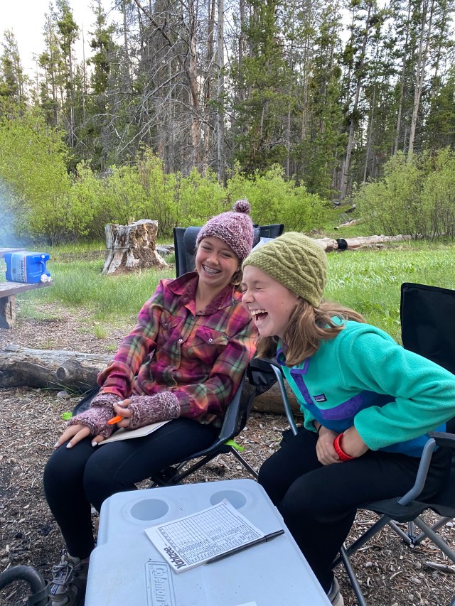 The latest on our two granddaughters who apparently are going to live forever with their Aunt Julie is that they spent the week camping in the mountains around Bozeman in Julie’s little camper. They look like they’re having fun and not missing Denver at all…..