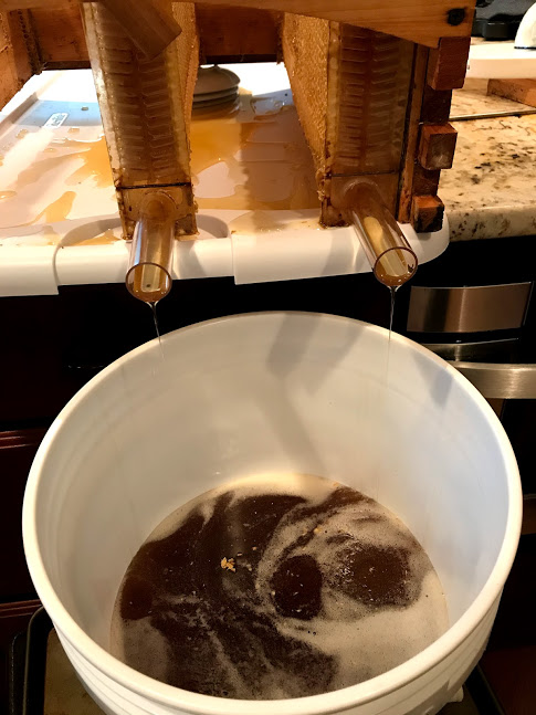 Dagny’s bee hives have been scraped and the honey has been harvested. Apparently the bees weren’t thrilled that two humans were messing with the hive on which they had worked so hard over the past few months. Three stings total between Dave and Dagny, and one of them was from a bee who had made its way into the house. One whole afternoon was spent draining the hives…..