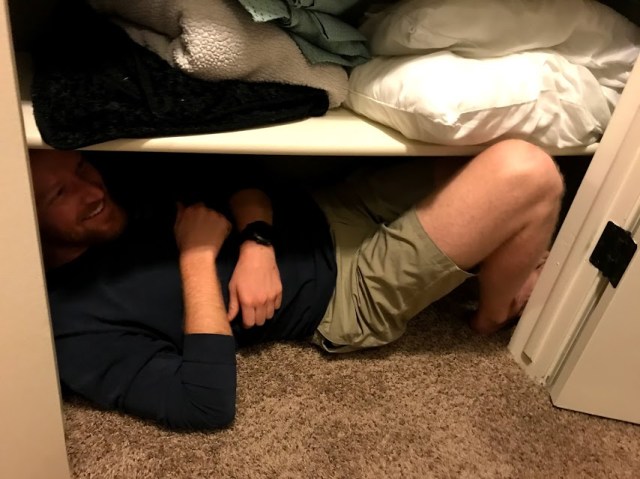 Rob and Jessie are both engineers. He is still working from home, but Jessie goes out to job sites all day. She is tired when she gets home. A few weeks ago, she walked in the door only to find a nerf gun and a note. The message was written like a Mission Impossible task. She was to find the enemy (Rob) and shoot him before he shot her. God bless her; she undertook the mission. She looked throughout the house for at least 30 minutes, but was unable to locate him. She believed she had looked everywhere, but he was nowhere to be found. She finally gave up on the mission, and he showed himself. He had hidden in their linen closet, where he had been for at least 30 or 40 minutes. She noted that she walked by the linen closet, but never opened the door because she KNEW there was NO WAY he could fit into the space…..