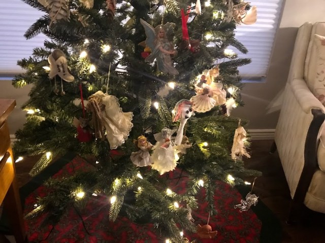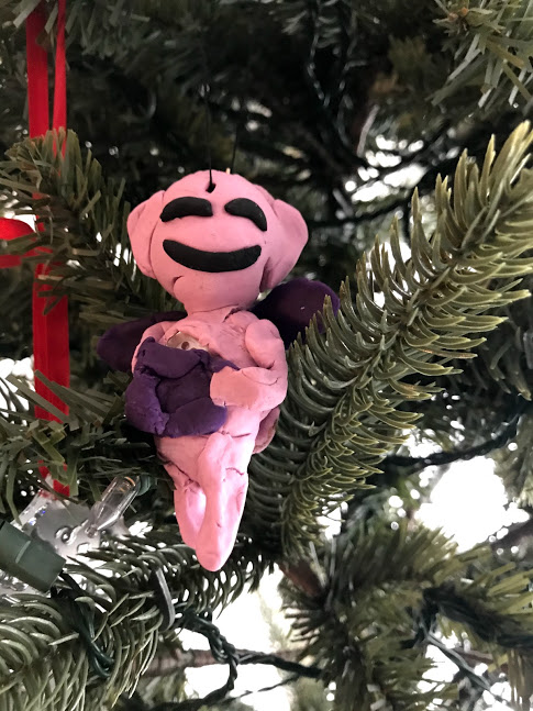 As I mentioned earlier this week, my three Zierk grands helped me decorate my angel tree. The ornaments on my angel tree are, of course, all angels. I have collected them over the past nearly 30 years. Many were gifts; some I purchased while traveling; some are hand made. Though each and every one is some sort of angel, it might be a Santa Claus with angel wings, or a teddy bear with angel wings. The angels are made from tin and wood and ceramic and fabric. You name it; it’s probably on my tree. I even have one that is made entirely out of pasta. My stepmother made that by hand. One of my favorites, I will admit, is a chicken with angel wings. However, Miss Mylee — a lover of All Things Monkeys — was aghast that I didn’t have a monkey angel. I suggested she make one, and so she did. Modeled out of Play Doh, the monkey comes complete with a purple knapsack, purple angel wings, and a pink tail…..
