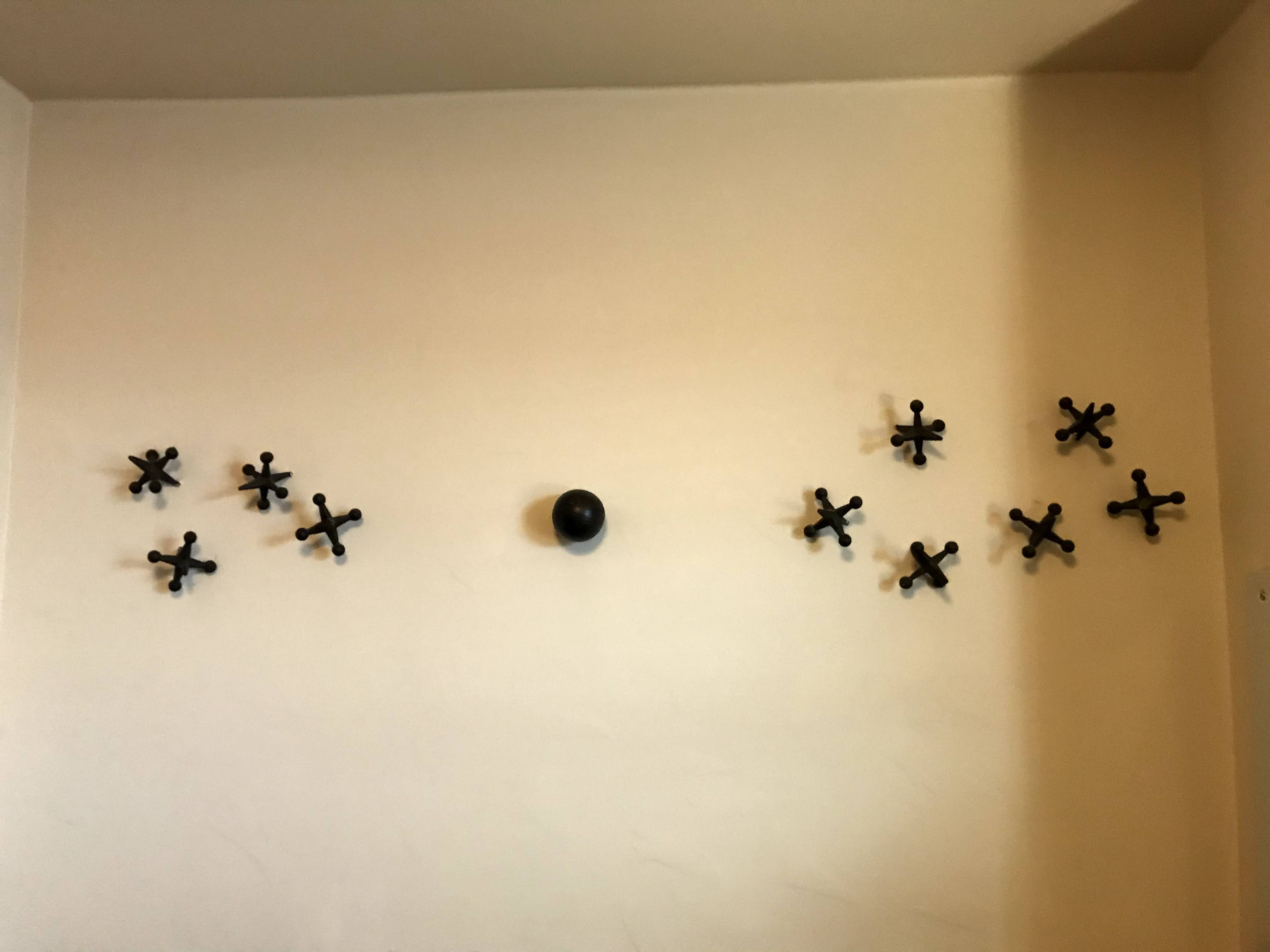 It took me immediately back to my childhood. I played lots of games of Jacks. How do you play? Bill wondered. You bounce the red ball and pick up one jack; you bounce the red ball and pick up two jacks; you bounce the red ball and pick up three jacks. And so on. Jacks and Pick-up Stix. Wow. Those were the days before technology. And weird wall decorations.