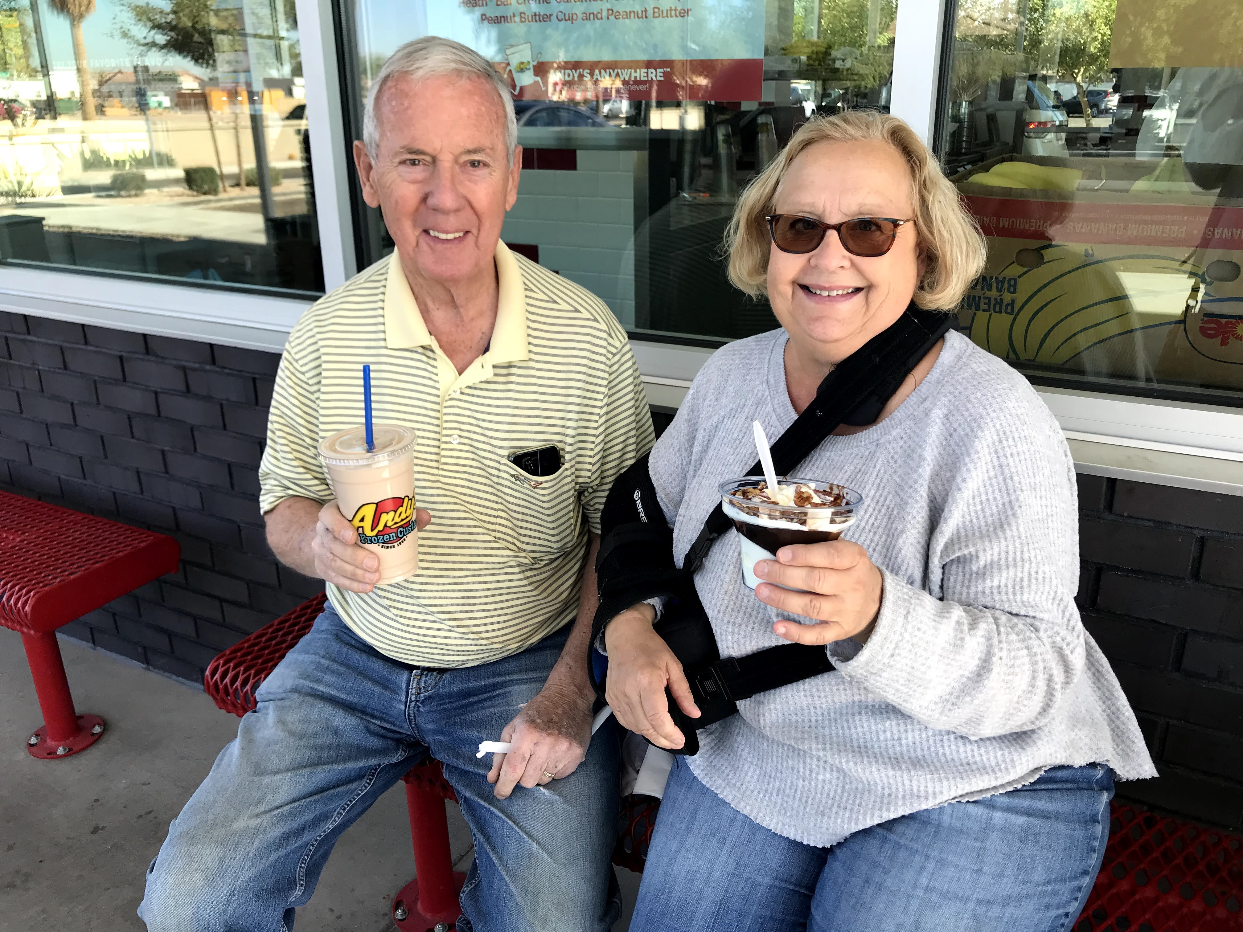 Yesterday, we cooked ourselves a nice breakfast — bacon, eggs, and toast. Then around lunchtime, we got in our car and headed to Andy’s Frozen Custard. What the heck? we thought. We are grown ups and we can eat whatever we want for lunch. Jen and I had turtle sundaes and Bill went with his favorite: a hot fudge malt, large please. We honestly didn’t feel a bit guilty…..