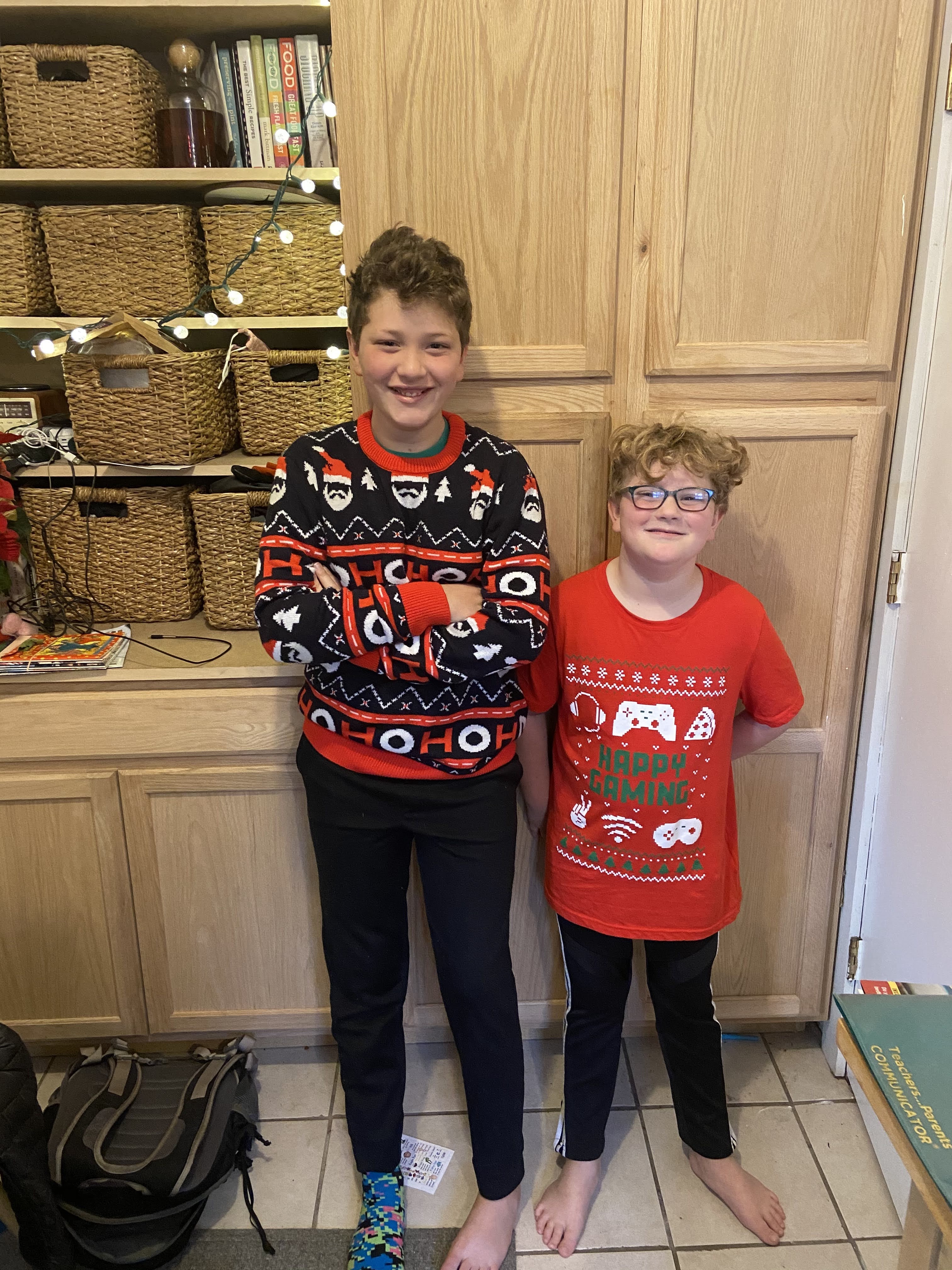 Up until a few years ago, on Thanksgiving Day I started wearing Christmas sweaters. I bought a new one each year, and owned many, enough so that I could wear a new sweater to work nearly every day until Christmas. But they started getting old and beads on the Christmas trees and snowmen began falling off. Furthermore, the schtick sort of wore off and the sweaters began looking a little too, well, Christmasy, even for my taste. So I tucked them into a drawer. There they stayed until a couple of years ago when my grandkids started borrowing them every year for the annual Ugly Christmas Sweater Contest sponsored by their church youth group. And they almost always won because they were, indeed, ugly. The tradition continues, though these sweaters aren’t even close to as ugly as mine. I received this photo from Vermont, featuring Joseph and Micah in their Christmas duds…..