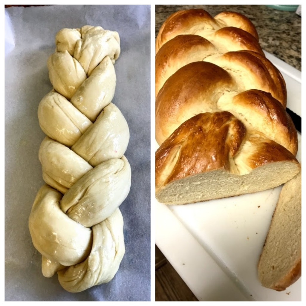 When my dad and mom owned the bakery in Columbus, every Christmas, among the traditional holiday treats that Dad baked was a loaf of braided bread. The bread was delicious, and we sold loaf after loaf after loaf. We closed the bags using curling ribbon, and my fingers got sore from curling red and green ribbon. A couple of years ago, I checked the internet to see if I could find the bread recipe. Lo, and behold, I learned that the bread is called Zopf, and it is a traditional Swiss holiday bread. Last year, I made a loaf that I think was marginally successful. It looked better than it tasted, as I recall…..
