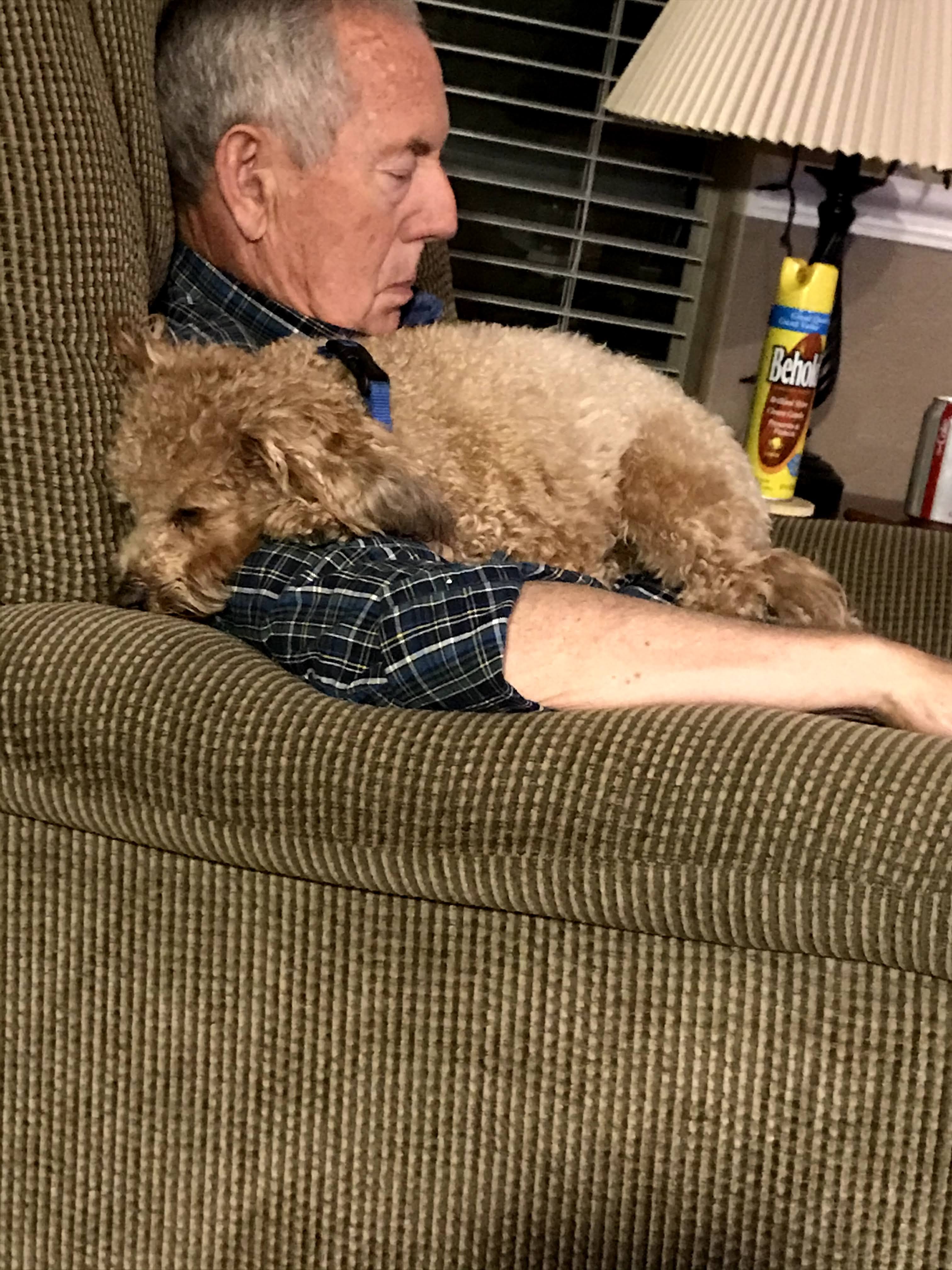 I have mentioned before that Jen’s pooch Winston loves Bill. I can feed him and pet him and take him for walks, but at the end of the day, he picks Bill. He has great taste. The other night, Jen went to the Desert Botanical Gardens with her daughter Maggie and our sister Bec. The Garden was decorated with beautiful luminaries. Bill and I stayed home. Winston was distraught, but finally found his peace with his BFF. The two share a great napping experience…..