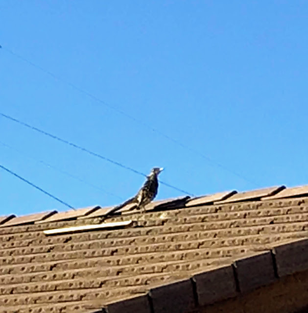 Speaking of moisture, the other day I noticed that a blooming bush in our front yard was not only not blooming, but the leaves were turning yellow. Since our watering is done with a very quiet drip system, I began to wonder if perhaps it was being a bit TOO quiet. Bill checked, and sure enough, the water hasn’t been on at all since we got here. We’re blaming it on a mischievous roadrunner who visits our yard nearly every day. We had a roadrunner last winter as well. There is, of course, no way of knowing if it is the same fellow, but word travels quickly in the roadrunner world. Our first sighting was last week, when Bill was working on his car in the garage with the door open. He looked up from his work to see Mr. Roadrunner sashay into the garage. Here is a terrible photo of him on our neighbor’s roof…..