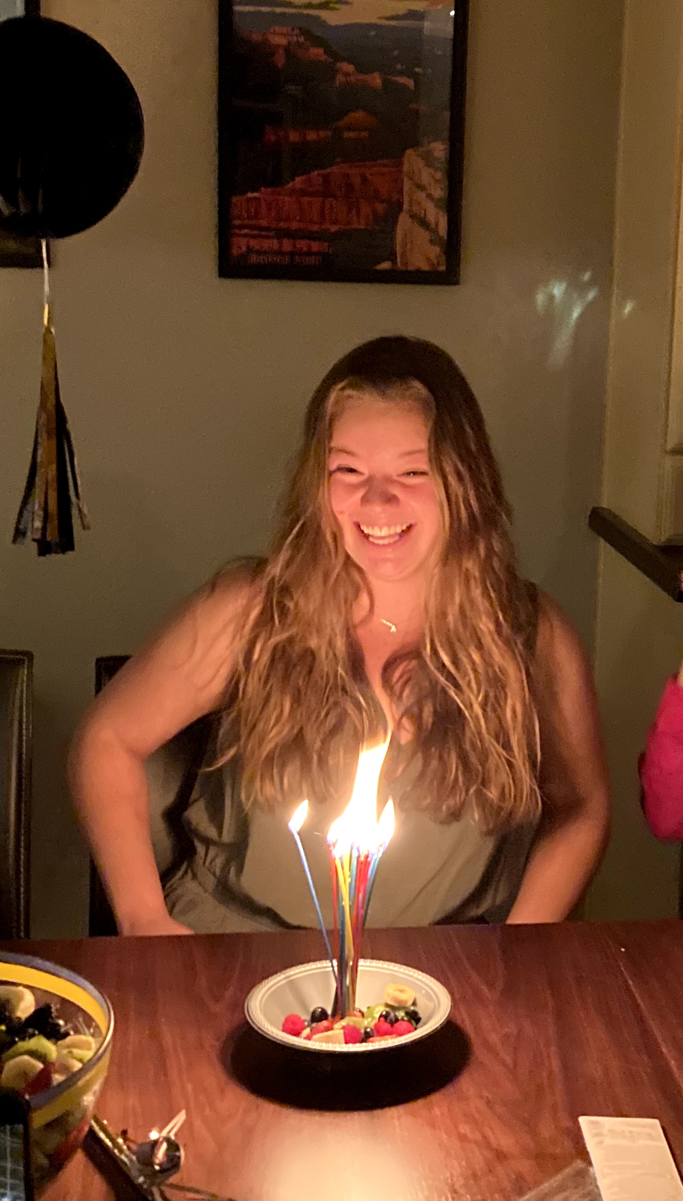 While we were in Denver last week, we were lucky enough to be able to celebrate our eldest grandchild’s 18th birthday with her. We discussed what she can legally do now that she couldn’t do when she wasn’t yet 18. She can vote. She can serve in the military. She can get a tattoo without her parents’ permission. She can serve on a jury. She can accompany her younger siblings into a R-rated movie. So, I know she will vote. I know she will serve on a jury if called. She might take her younger siblings to an R-rated move, but only if her parents say it’s okay. As for the military, she is currently awaiting to hear from the Air Force Academy as to whether she receives an appointment. Then we will see. In the meantime, rather than birthday cake (because she gave up sweets for Lent), she had a beautiful bowl of fruit. She put 18 candles into a banana, and lit them. Unfortunately, they were the sparkler kind of candles, and this happened…..
