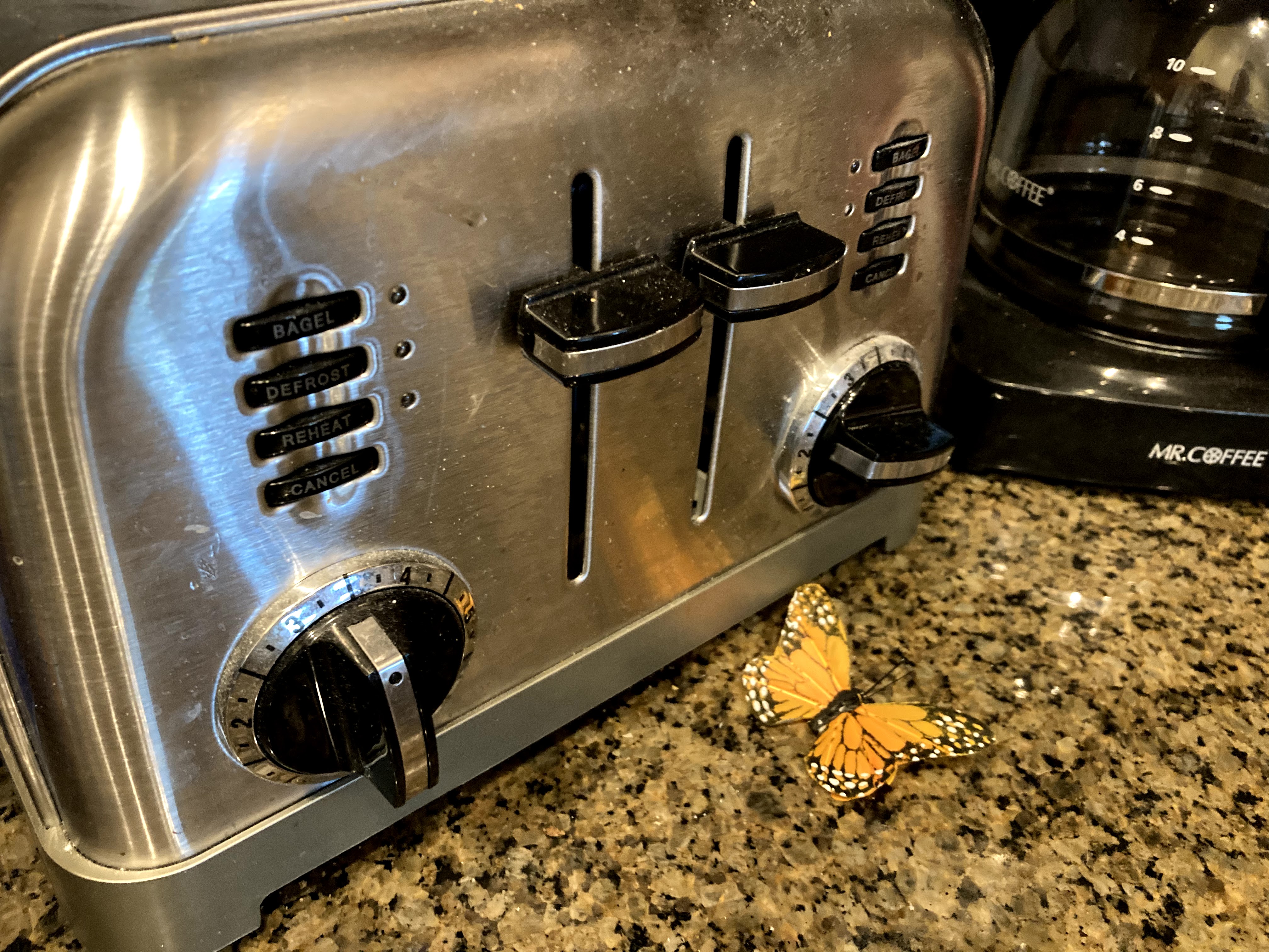 Please ignore the fingerprints on my toaster and pay attention instead to the monarch butterfly. I stared at the beautiful thing for an inordinately long time, trying like hell to figure out how a butterfly got into our house.
